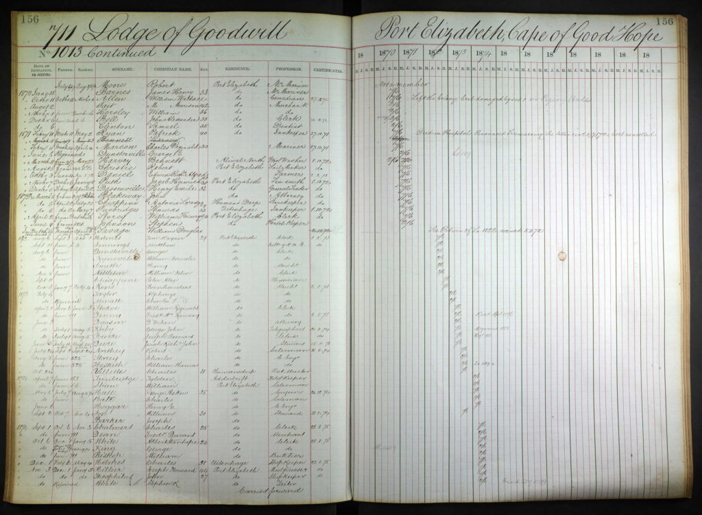 5 Dec 1871 - admission to United Grand Lodge of England Freemason, General Trader, Port Elizabeth Lodge.