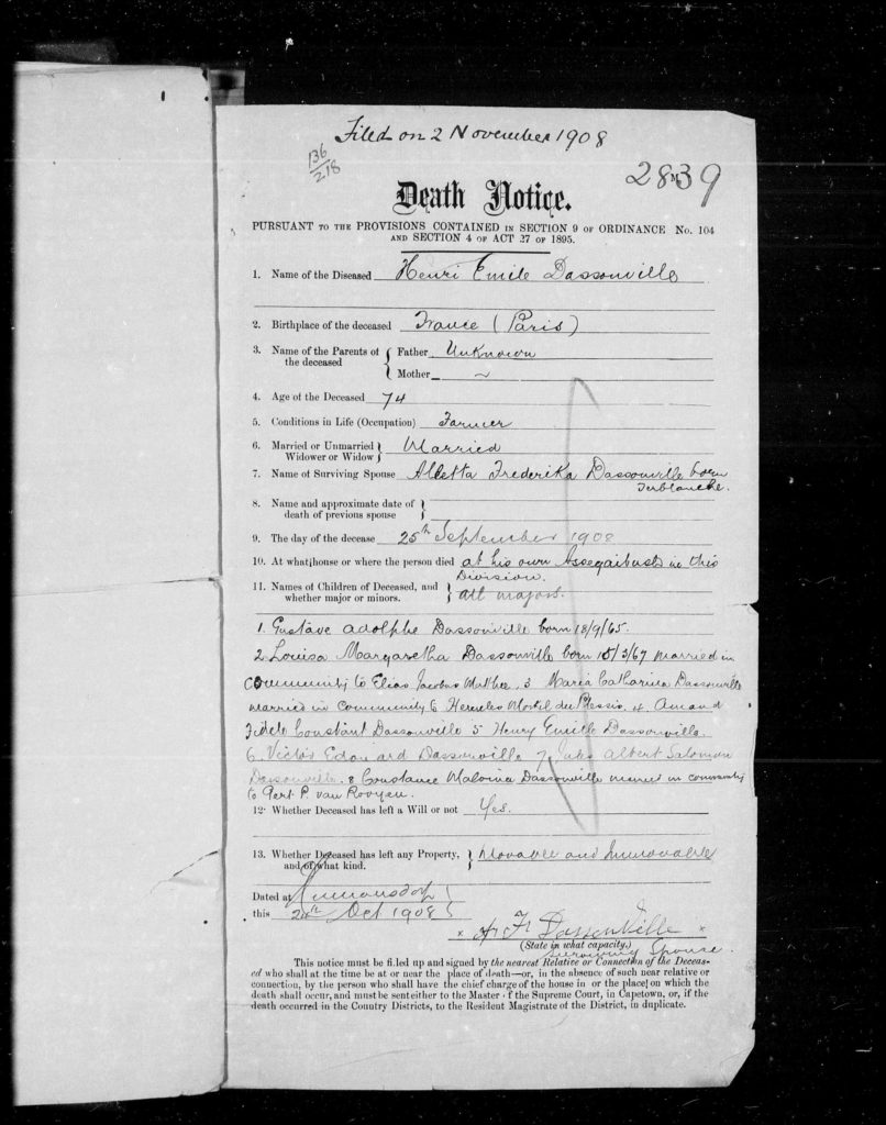 "She was married to the late Monsieur Henri Emile D'Assonville, who landed in Port Elizabeth in 1859"